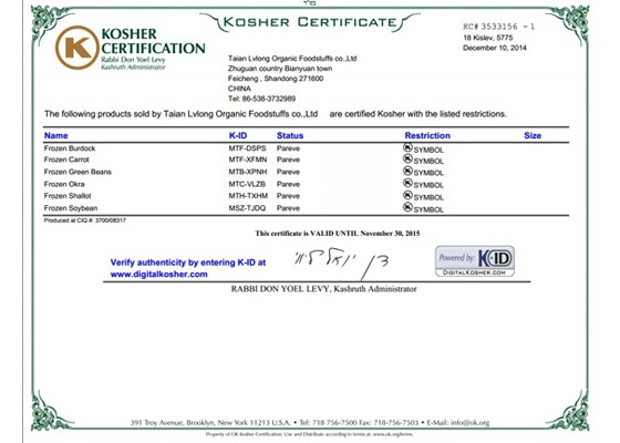 日前,泰安綠龍有機食品有限公司順利通過歐美“KOSHER”認證。 2014年11月9日至10日,“KOSHER”認證機構審核人員參觀了泰安綠龍公司的生產現場,并對公司的質量和環境管理體系進行了嚴格的考察、評估,12月10日,綠龍公司取得“KOSHER”認證證書!